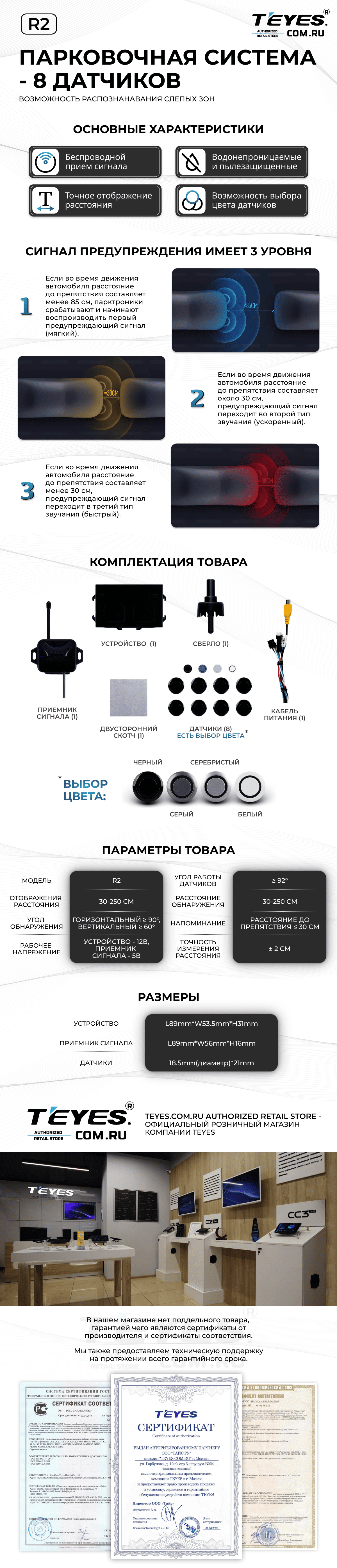 Передние и задние парктроники Teyes R2 для CC4 Pro / CC4 / CC4L / CC3 2K / CC3 / CC3L / CC2 Plus / SPRO Plus / TPRO2 / LUX ONE (Серебристые) 8-датчиков - купить всего за 19 900 руб. в интернет-магазине в Мурманске Teyes.com.ru. ✓ Самый лучший выбор мультимедиа ✓ Лучшая замена штатному ГУ ✓ Тел. +7 (800) 775-31-74