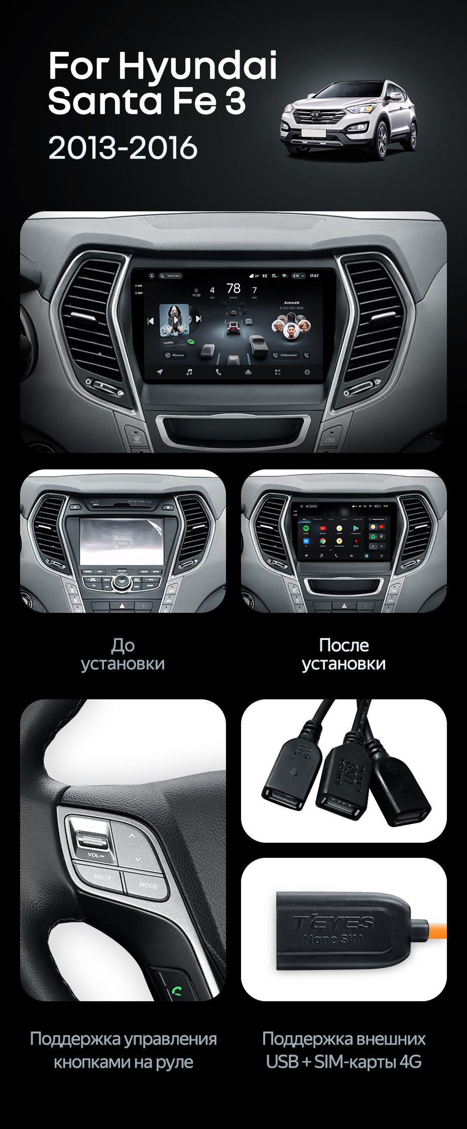 Штатная магнитола Teyes CC4 Pro 8/128 Hyundai Santa Fe 3 (2013-2016) Тип-A - купить всего за 58 250 руб. в интернет-магазине в Мурманске Teyes.com.ru. ✓ Самый лучший выбор мультимедиа ✓ Лучшая замена штатному ГУ ✓ Тел. +7 (800) 775-31-74