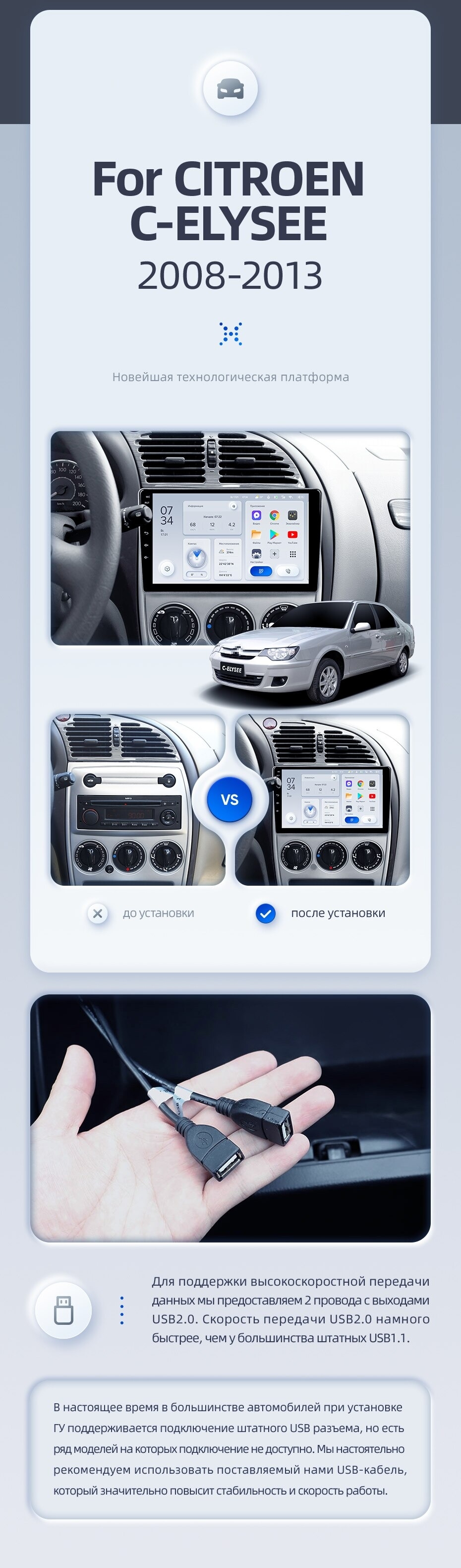 | USB | 3×USB 2.0 + USB 3.0 | Доп. аксессуары | Передняя/задняя AHD-камера, DVR-регистратор, TPMS, парковочный OBD, Type-C → HDMI |