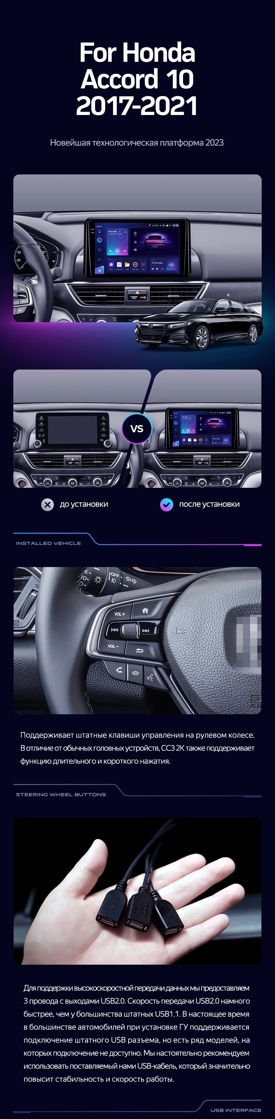Полный комплект установки магнитолы Teyes с рамкой и проводкой можно выбрать в каталоге штатных магнитол Honda Accord 10 CV (2017-2021).
