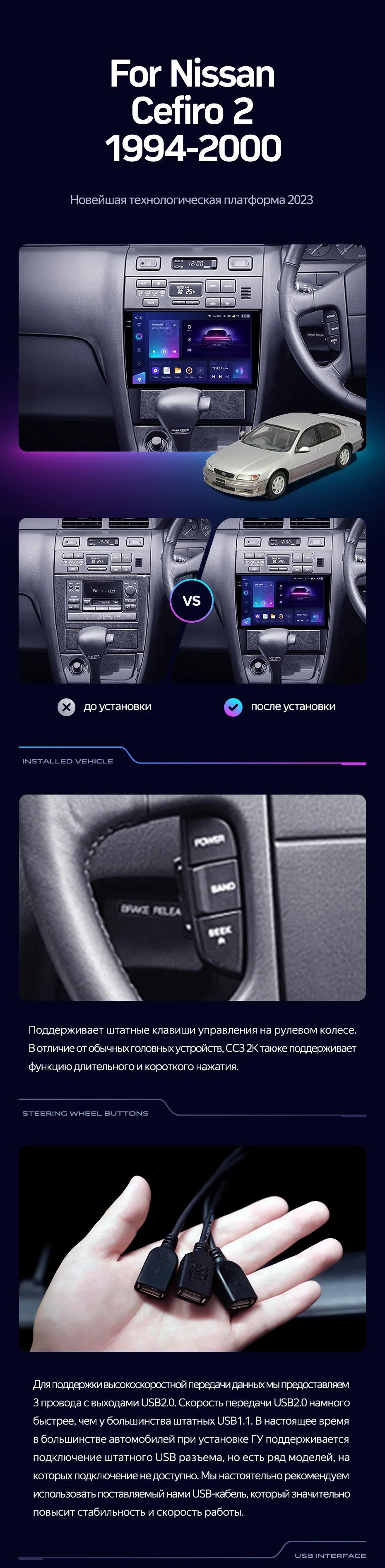 Полный комплект установки магнитолы Teyes с рамкой и проводкой можно выбрать в каталоге штатных магнитол Nissan Cefiro 2 A32 (1994-2000).