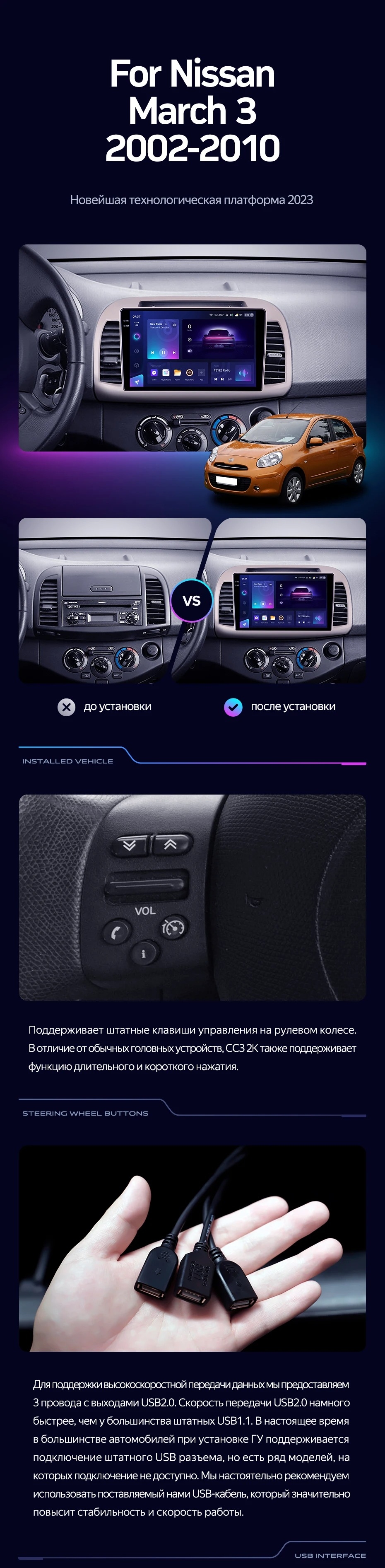 Полный комплект установки магнитолы Teyes с рамкой и проводкой можно выбрать в каталоге штатных магнитол Nissan March 3 K12 (2002-2010).