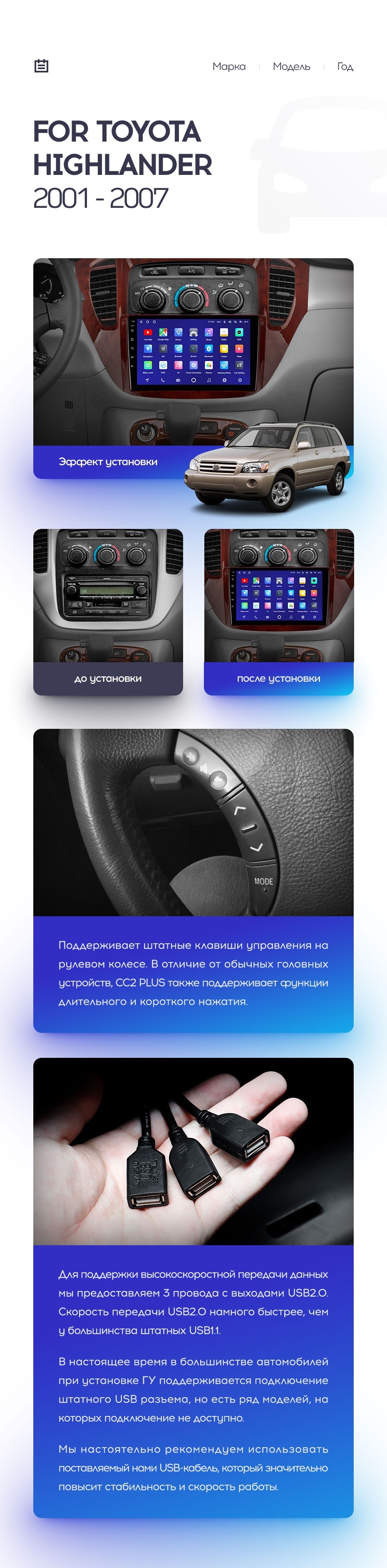 Полный комплект установки магнитолы Teyes с рамкой и проводкой можно выбрать в каталоге штатных магнитол Toyota Highlander 1 XU20 (2001-2007).
